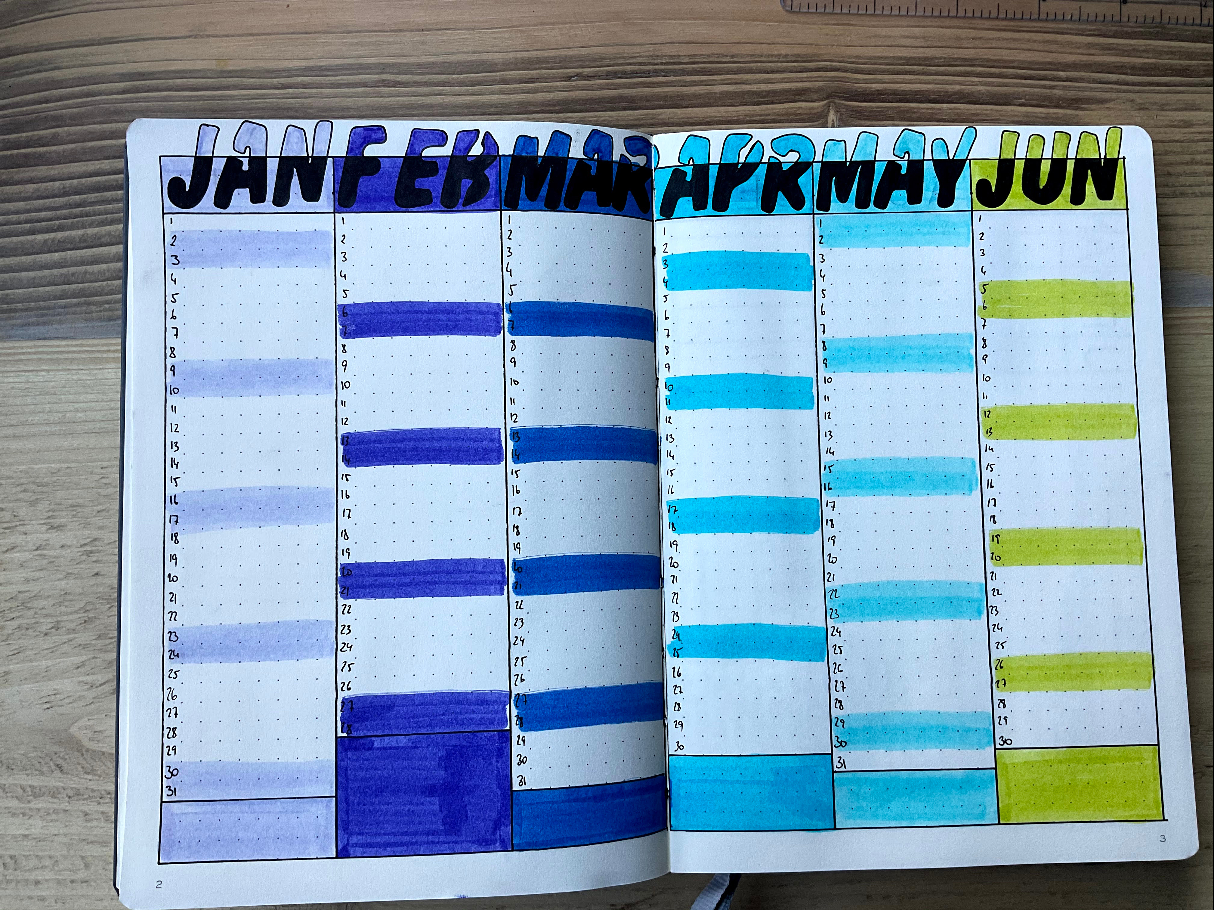 This year I’m ditching my colour dot index as I never really keep up with it – I will use post-it index stickers as I go and mark the month pages for quick navigation. I start my journal with a 6 months overview where I add birthdays, annual leave etc. I also have an overview for July to December to keep an eye on things before the new journal starts.