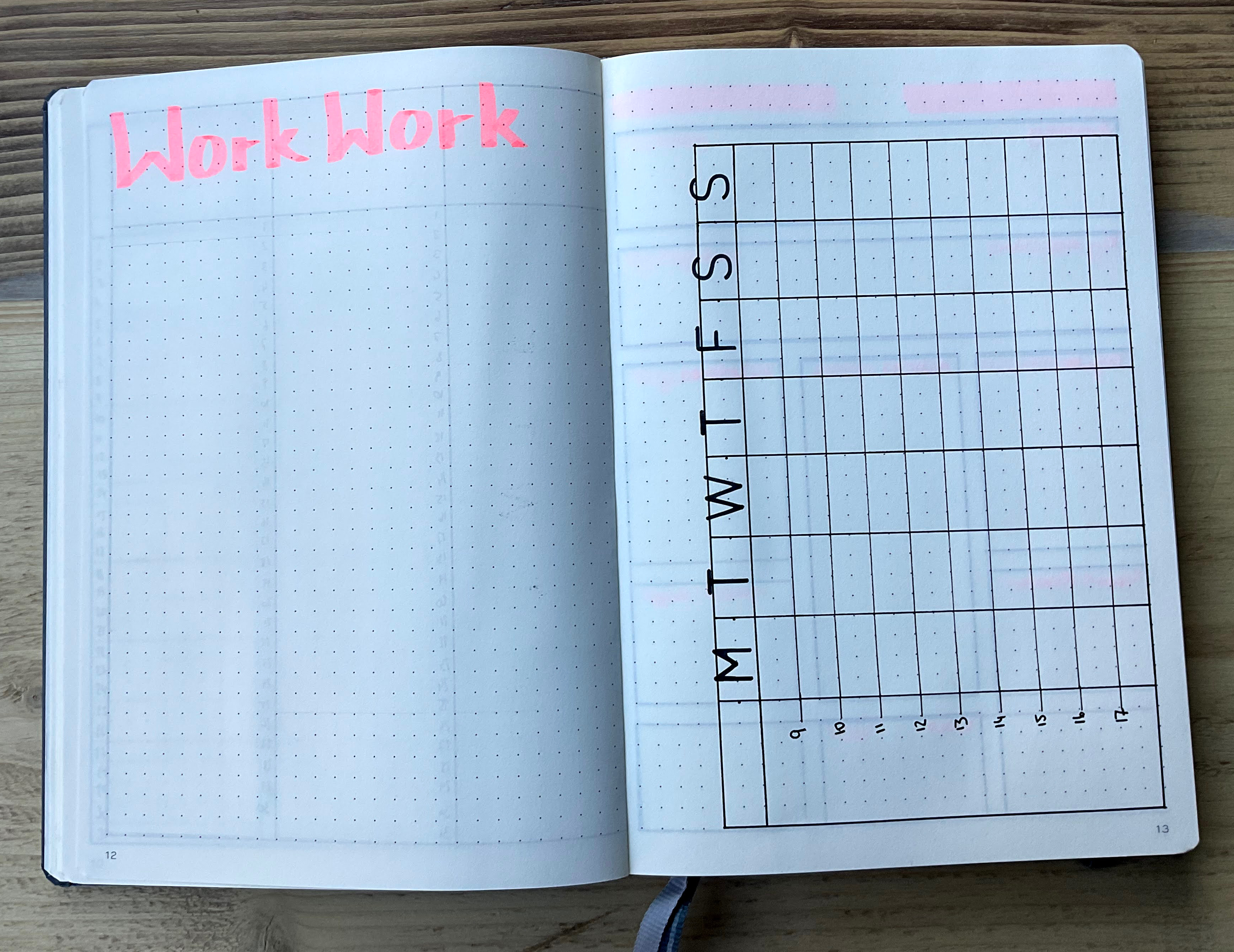 And after all this my journal actually starts. I use a monthly overview page – mostly to highlight the start of the month as I can mark this page with a sticker. This helps with navigation later on. Over the years I have come to love the weekly layout. This works best for me and has become a big part of my planning. At the weekend I draw up the new week and then use my allocated time slots to plan what I can realistically achieve that week to move my projects forward. Adding the times and colour coded highlights for the different tasks makes this a very valuable part of my work week.