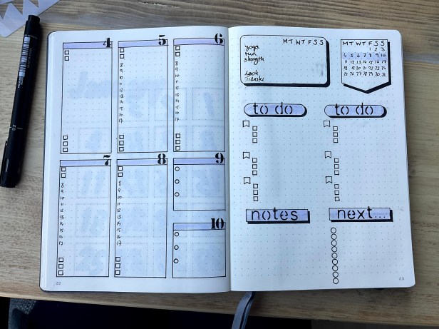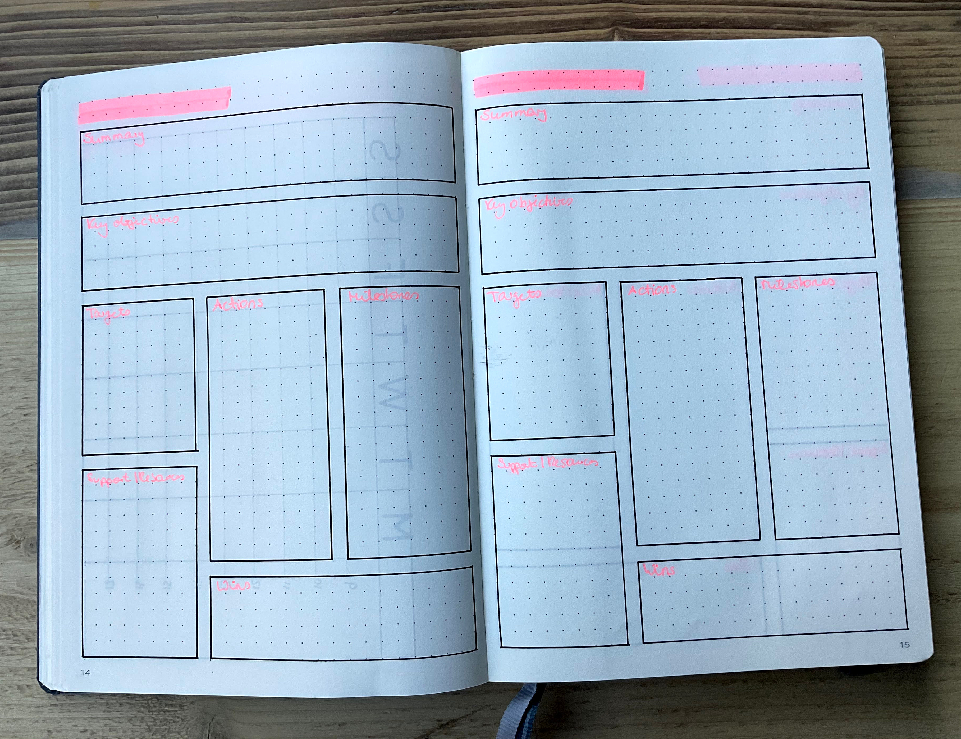To keep an eye on the details for each of my projects I’m using this project planner layout, I found online. This allows me to plan things and have all my projects in one place at the start of the journal. Since a journal lasts six months, I think six projects are enough. Should I run out of space I can always add another project planner page later on.