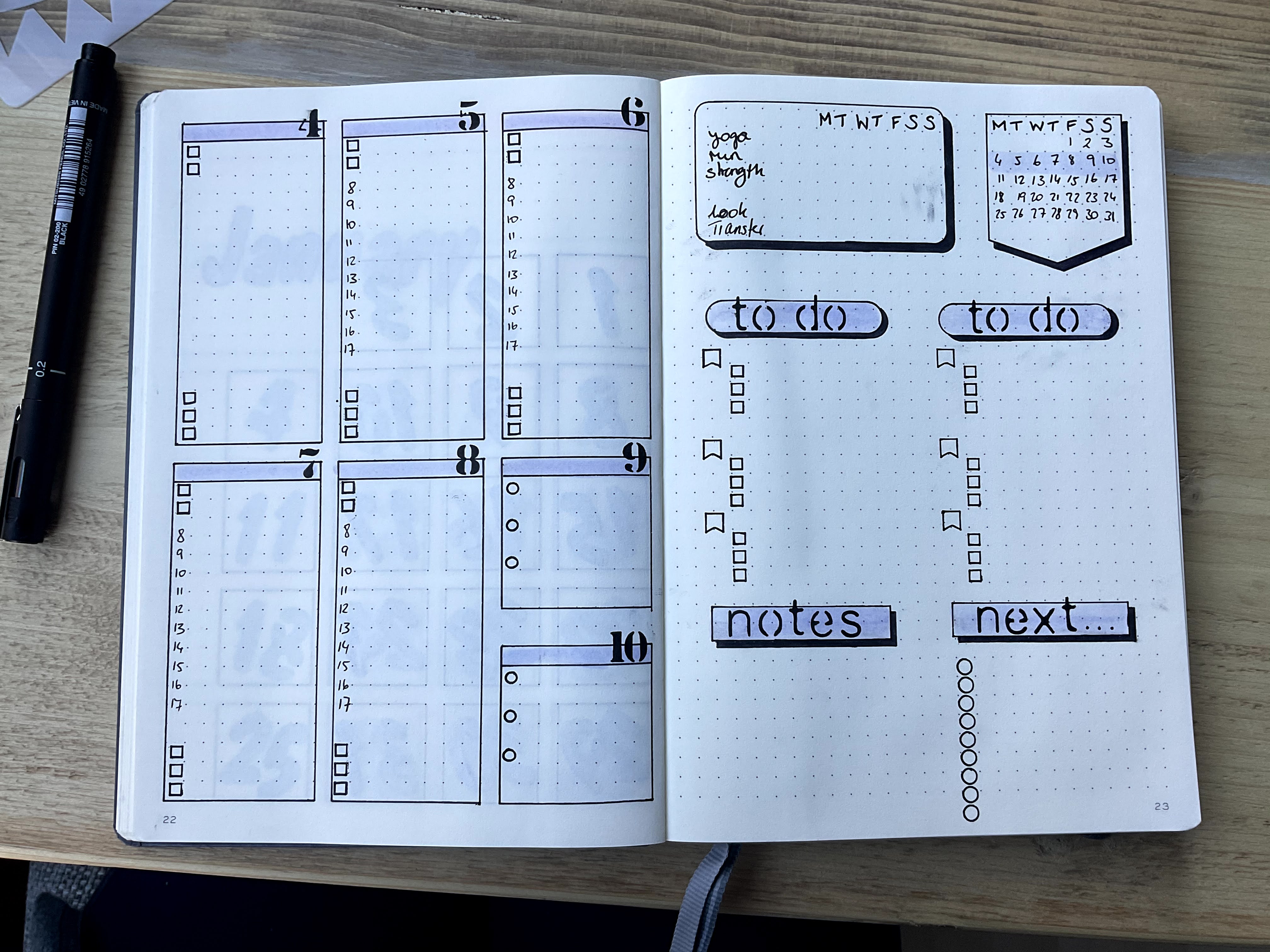 The running log is follow by a habit tracker. My habit trackers have changed a lot in my journals and this is a new layout for me. I think seeing all six months in one overview will be really nice. The columns allow for some flexibility but I will have to track the same things each month for comparison. I haven’t decide what to focus on yet, which is why the columns are still empty.