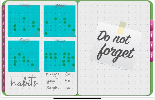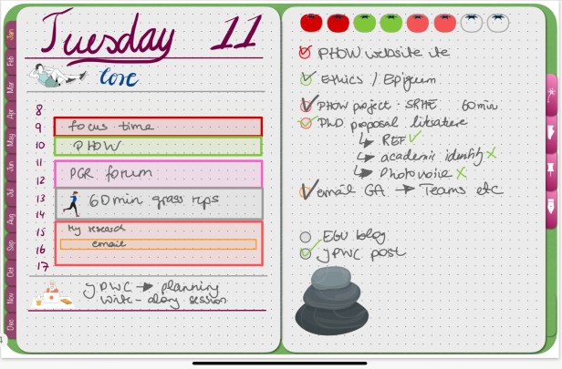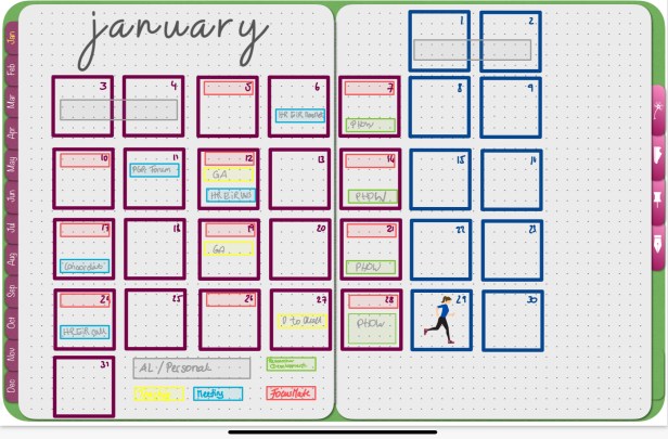 Thanks to hyperlinks and being able to add pages where I want I added my heath and running section to the back and added an ideas and writing section. These are hyperlinked via the 4 tabs on the right hand side. I’m not quite used to the ideas and writing section but I’m getting better at using these for project management and my paper planning.